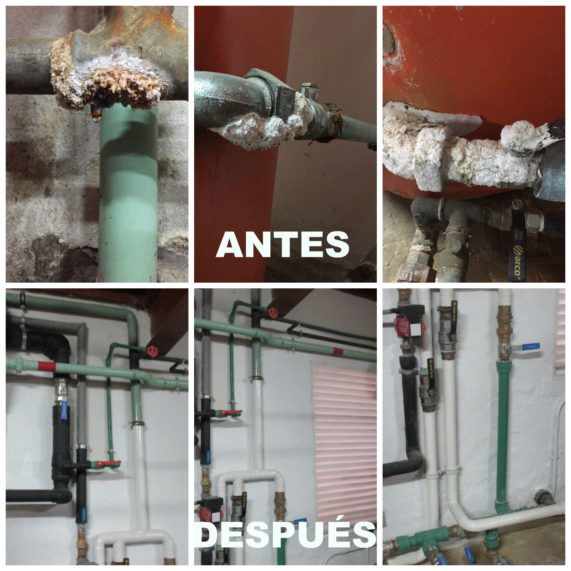 Exactamente se han sustituido las tuberías de entrada de agua fría, las de salida de agua caliente y las de retorno del agua caliente desde la entrada de las tuberías en la sala de calderas hasta los acumuladores, incluyendo la interconexión de estos cuatro acumuladores de agua caliente debido todo ello a su importante grado de deterioro (fisuras, poros, picados etc.) que ha sufrido el conjunto de estas canalizaciones y/o tuberías con el paso del tiempo y por el deterioro progresivo de su uso normal.