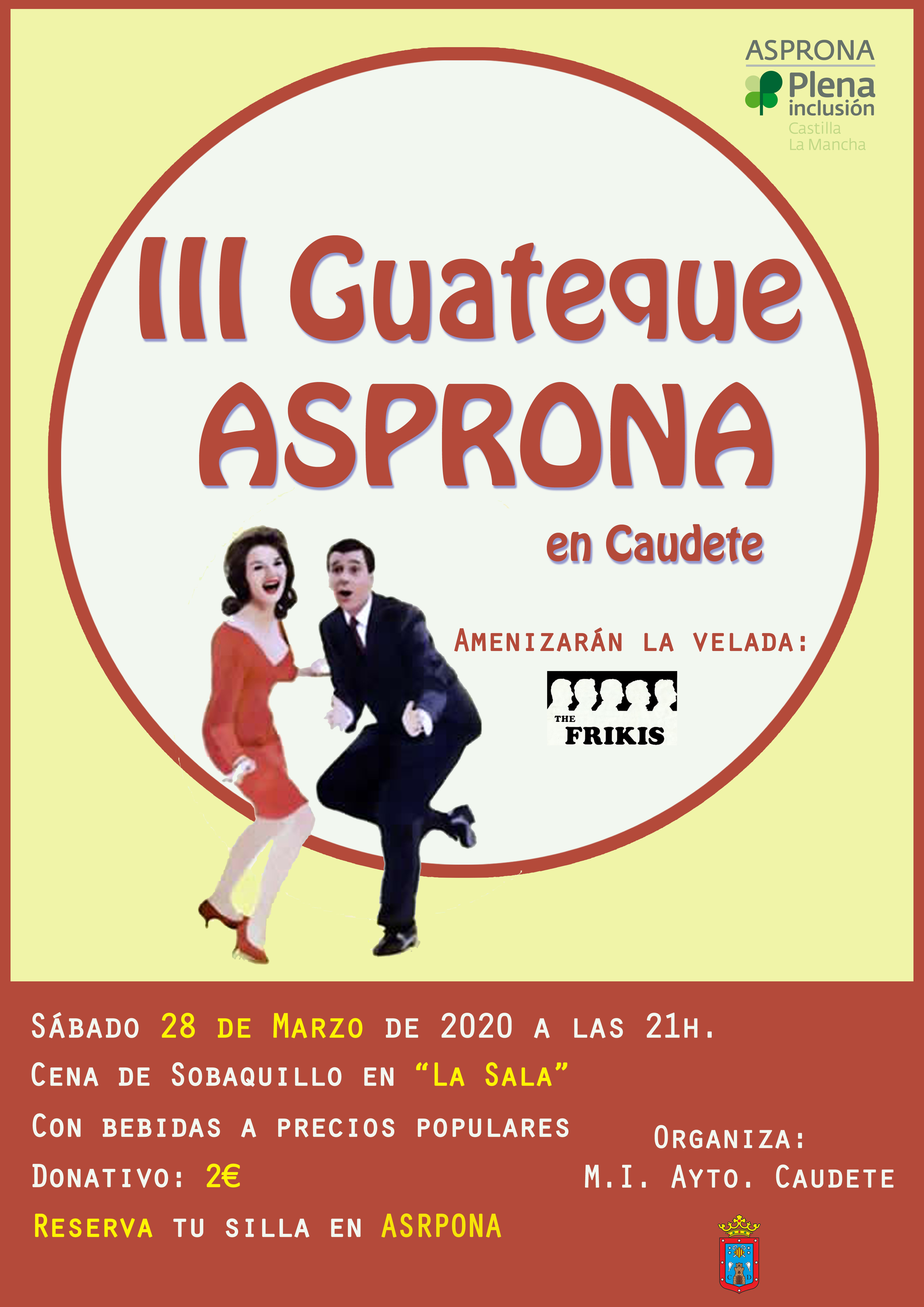 - ASPRONA en Caudete celebra el sábado 28 de marzo el III Guateque de ASPRONA con Cena de Sobaquillo. No os lo podéis perder… Tendremos música en directo del grupo local Los FrikisHabrá barra con bebidas a precios populares.La donación y reserva de silla son 2€/persona a beneficio de ASPRONA.Para reservar en el Centro Ocupacional Francisco Muñoz Molina C/Miguel Martínez, 16 o en el teléfono 965827067.