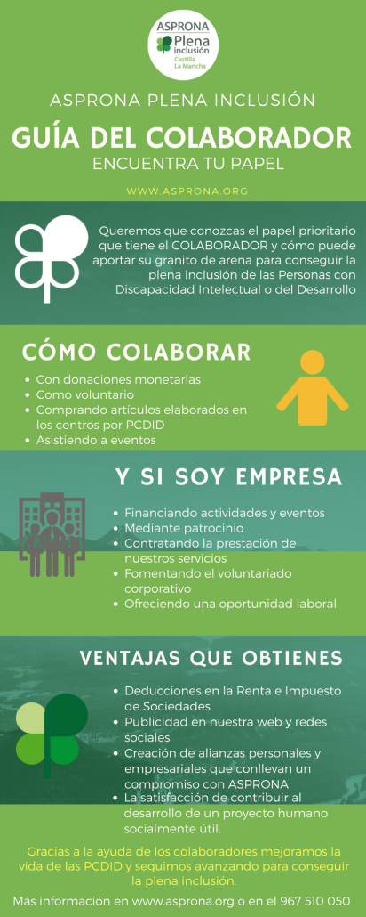 En ASPRONA queremos que conozcas la importancia que tiene para la Asociación los COLABORADORES y cómo puedes aportar tu granito de arena para conseguir la plena inclusión de las Personas con Discapacidad Intelectual o del Desarrollo (PCDID).