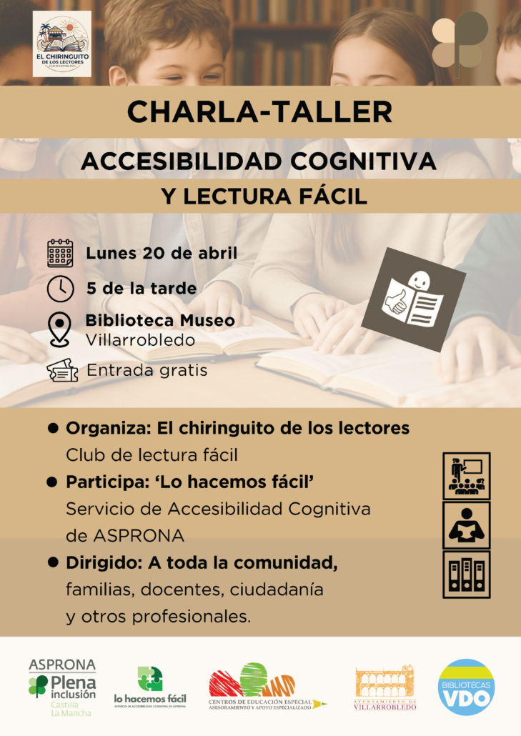 Lo hacemos fácil, en colaboración con el club de lectura fácil del Centro de Educación Especial (CEE) Infanta Elena, organiza «El chiringuito de los lectores», una charla-taller sobre accesibilidad cognitiva, que tendrá lugar el 20 de abril en la Biblioteca Museo de Villarrobledo.