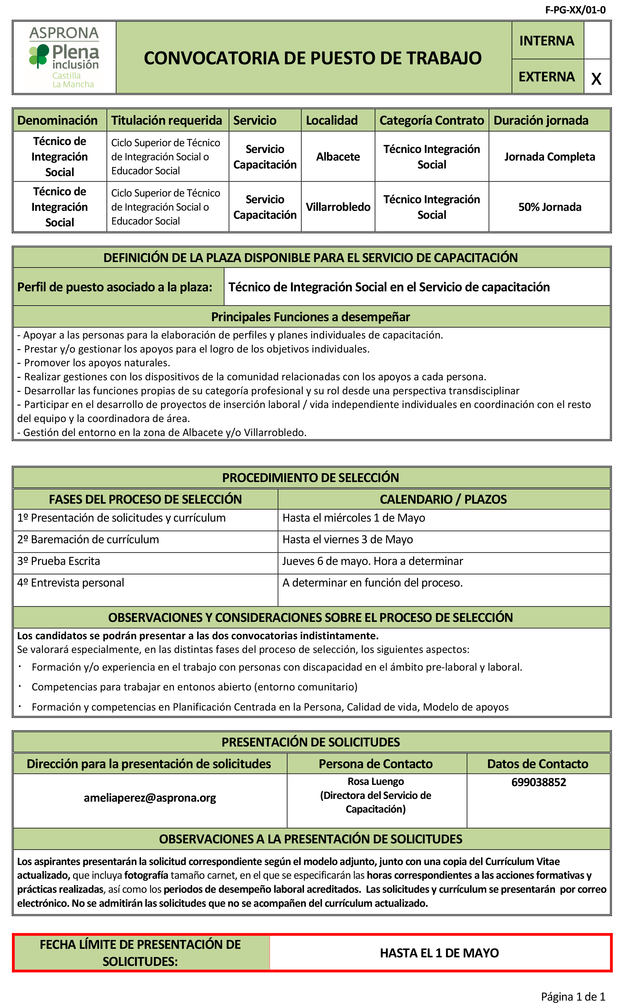 La fecha límite para la presentación de solicitudes y el envío de CV es el miércoles, 1 de mayo.