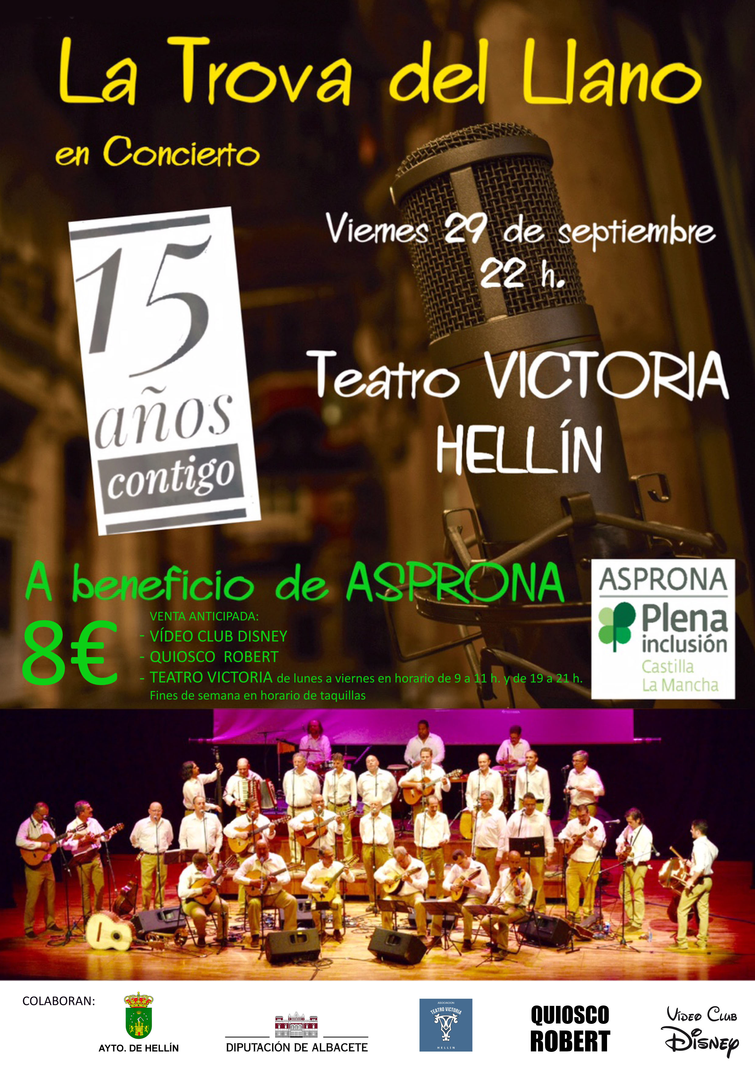 • Concierto de La Trova del Llano a beneficio de ASPRONA  el día 29 de septiembre a las 22:00 horas  en el Teatro Victoria. Precio de la entrada 8€.