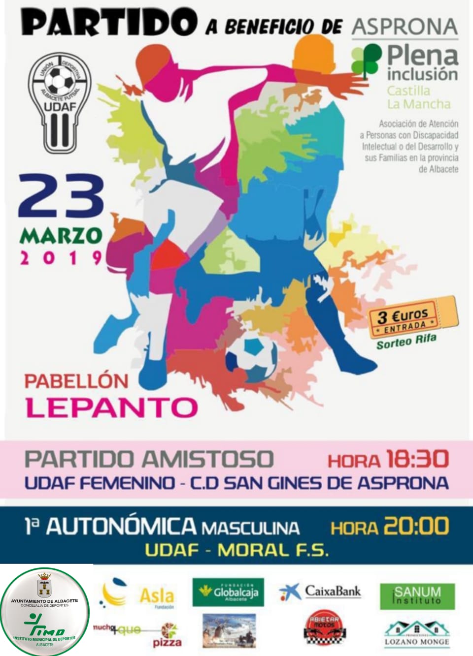 El próximo sábado, 23 de marzo, el Pabellón Lepanto de Albacete acogerá dos encuentros deportivos, en un evento solidario que tiene como cómplices a la Unión Deportiva Albacete Fútbol Sala (UDAF) y a Asprona. Ambos encuentros podrán presenciarse por el precio de tres euros, recaudación que irá destinada a Asprona.