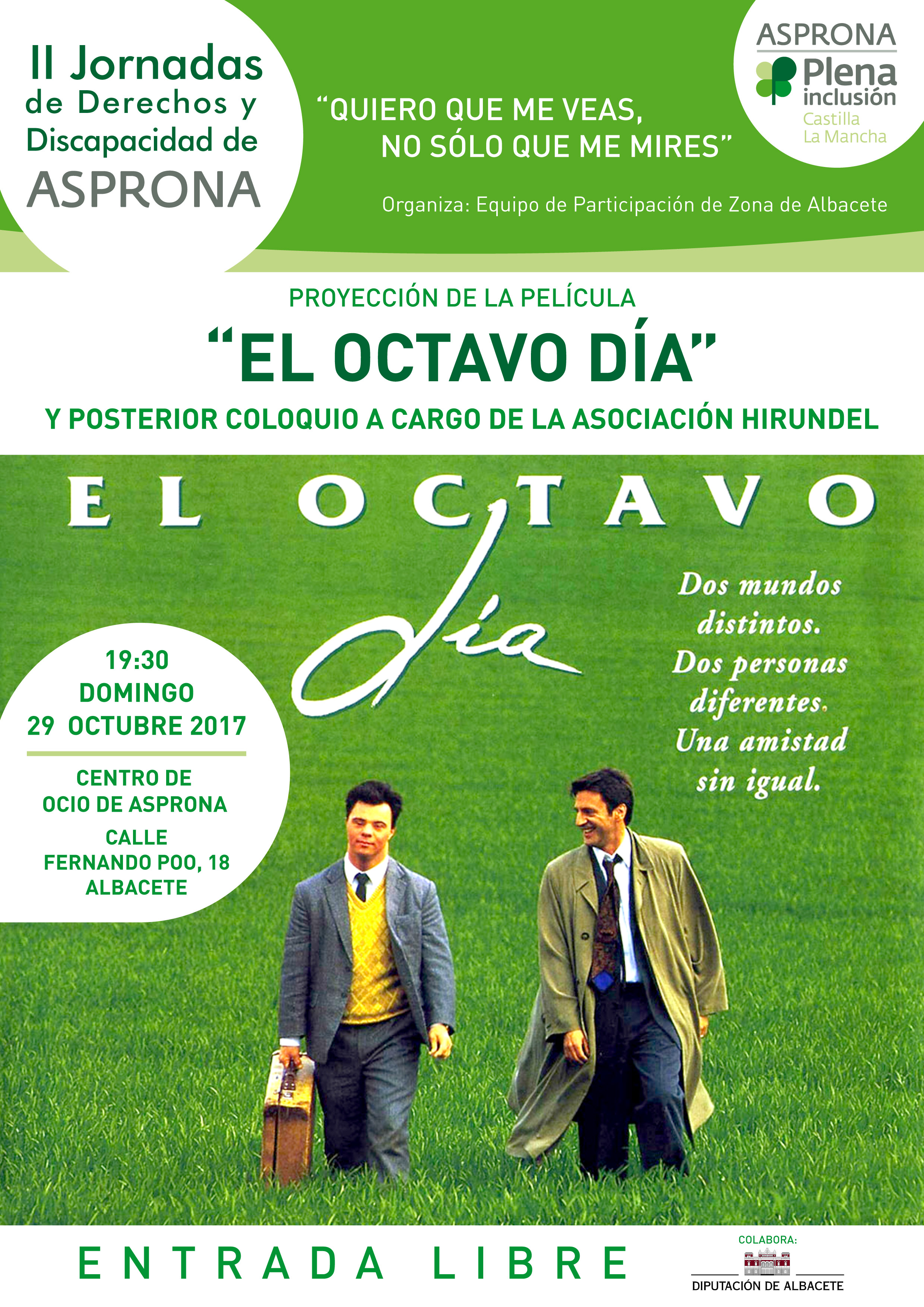 Desde principio de octubre se están llevando a cabo distintas actividades que se enmarcan dentro de la segunda edición de las Jornadas Derechos y Discapacidad de ASPRONA: ‘Quiero que me veas, no sólo que me mires’. La próxima actividad es la proyección de la película ‘El Octavo Día’ que tendrá lugar este domingo 29 de octubre en el Centro de Ocio de ASPRONA en Albacete a las 19.30 horas. Después habrá un coloquio que estará a cargo de la Asociación Hirundel.