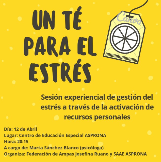 El jueves 12 de abril a las 20:15 horas se va a celebrar una actividad destinada a las familias ‘Un Té para el Estrés’ en el gimnasio del Centro Concertado de Educación Especial de ASPRONA en Almansa a través de la Escuela Local de Familias promovida por la Federación de AMPA´s Josefina Ruano y el SAAE del C.C.E.E. ASPRONA Almansa.