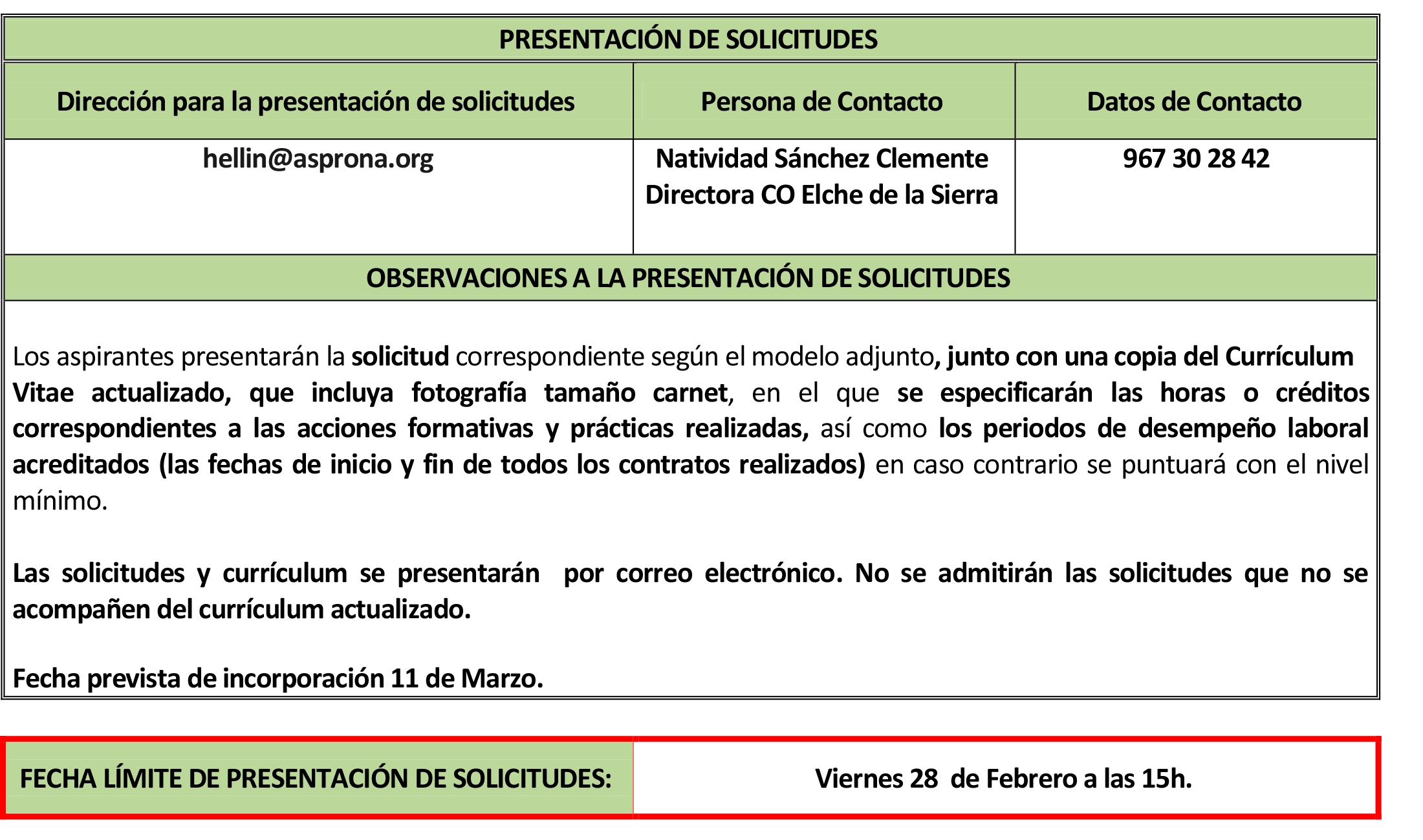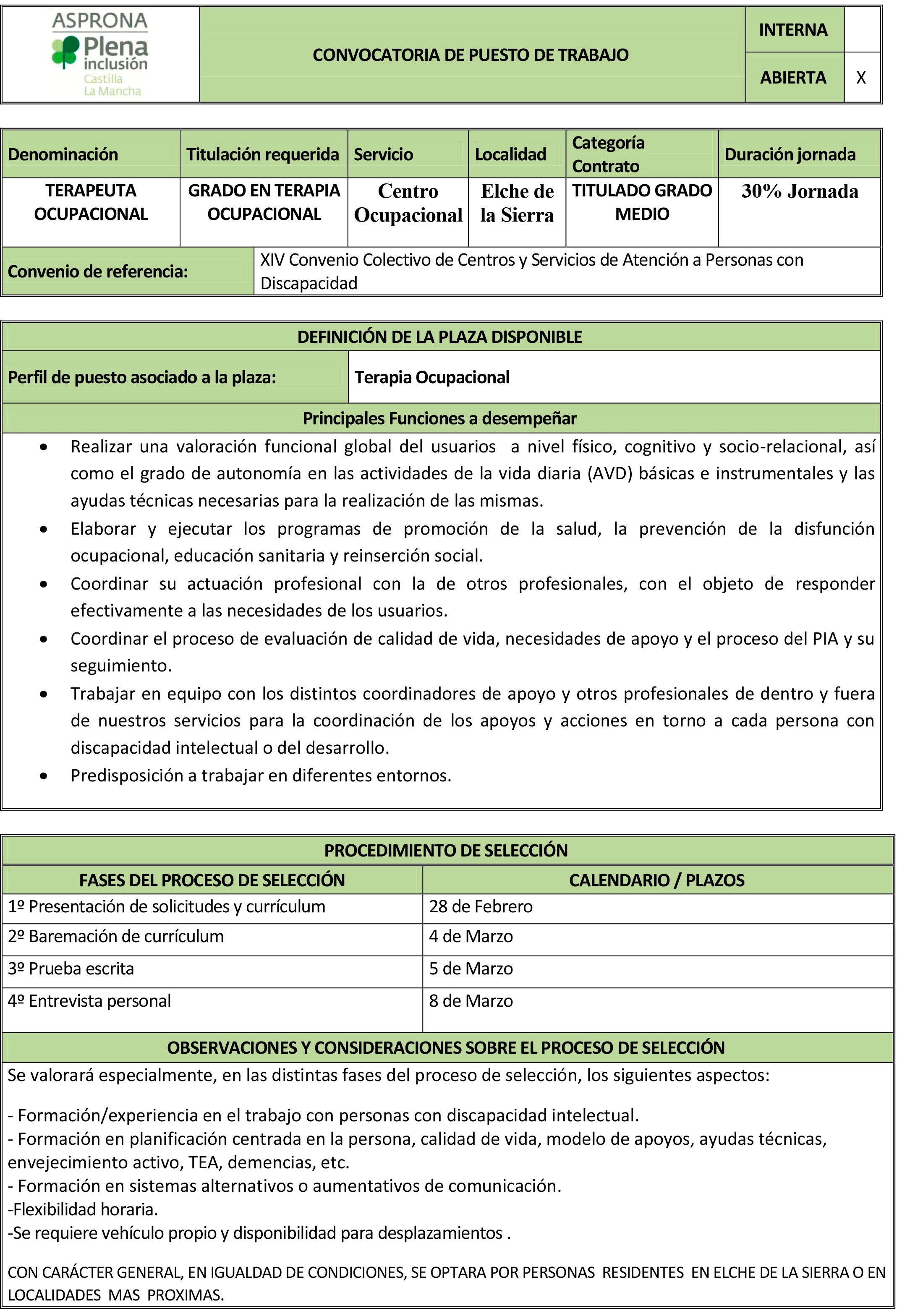 Proceso de selección para un puesto de empleo para el Centro Ocupacional de Asprona en Elche de la Sierra: Terapeuta Ocupacional. Fecha límite para presentar las solicitudes: Jueves, 28 de febrero a las 15:00 horas.