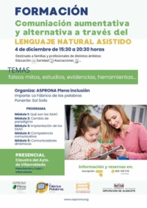 Dentro de las actividades previstas para celebrar el día Mundial de la Discapacidad, ASPRONA organiza en Villarrobledo el Curso ‘Comunicación Aumentativa y Alternativa a través del Lenguaje Natural Asistido’ dirigida a familiares y profesionales de diferentes ámbitos como asociaciones, educación o sanidad.